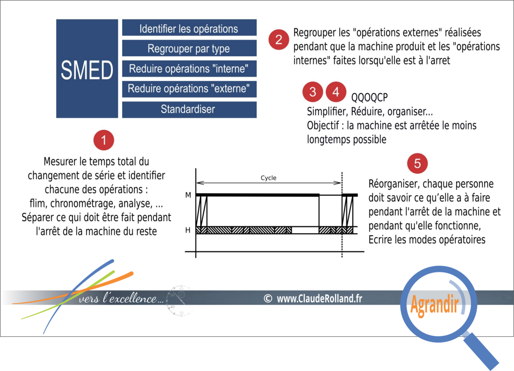 SMED est l'acronyme de "Single Minute Exchange of Dies", que l'on peut traduire par changement de réalisation sur un poste de travail en moins de 10 minutes. Il s'agit d'une méthode visant à réduire drastiquement le temps de changement de série.