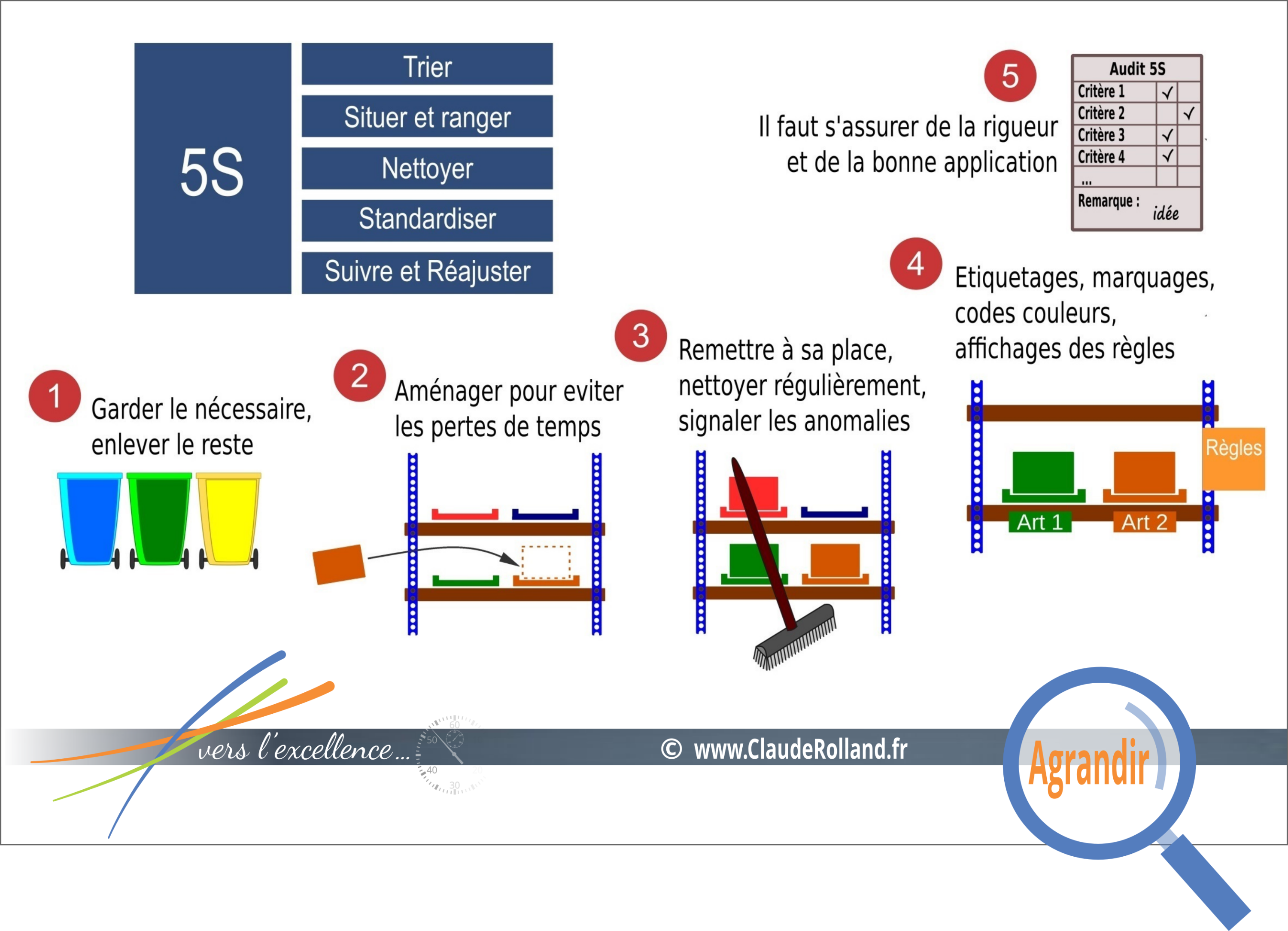 5S est une méthode d'organisation et d'amélioration des lieux de travail. Elle se base sur cinq étapes simples, dont chacune commence par la lettre  "S" en japonais.